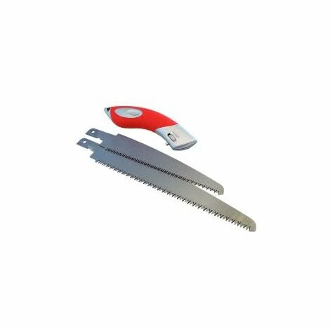 Diese Säge wird geliefert mit zwei Sägeblättern, einmal in 20,5 cm und einmal mit 25 cm. Sie können einfach zwischen den Längen wechseln, indem Sie das entsprechende Blatt in den ergonomisch geformten Griff stecken und mit Hilfe des Arretierrades fixieren.