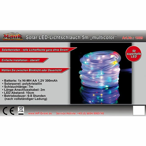Dieser mehrfarbige Solar LED-Lichtschlauch von Mauk ist ein sehr hübscher Deko-Artikel für den heimischen Garten. Mit diesem Farbenspiel aus energieeffizienten LED`s können Sie bis zu 8 Stunden bei sehr schöner Beleuchtung Grillabende und Partys auf der Terrasse genießen.